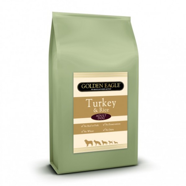 Golden Eagle Turkey & Rice on täisväärtuslik koeratoit, mis sisaldab kõiki toitaineid, mida teie koer vajab. Boonusena on see toode hüpoallergeeniliselt valmistatud ilma veiseliha, sealiha, nisu, nisugluteenita, piimatoodete, munade ja sojata.