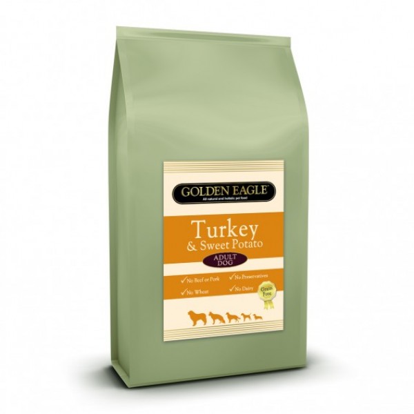 Golden Eagle Grainfree Turkey & Sweet Potato on teraviljavaba dieettoit täiskasvanud koertele, mis sisaldab kõiki toitaineid, mida teie koer vajab. Boonusena on see toode ka hüpoallergeenne.