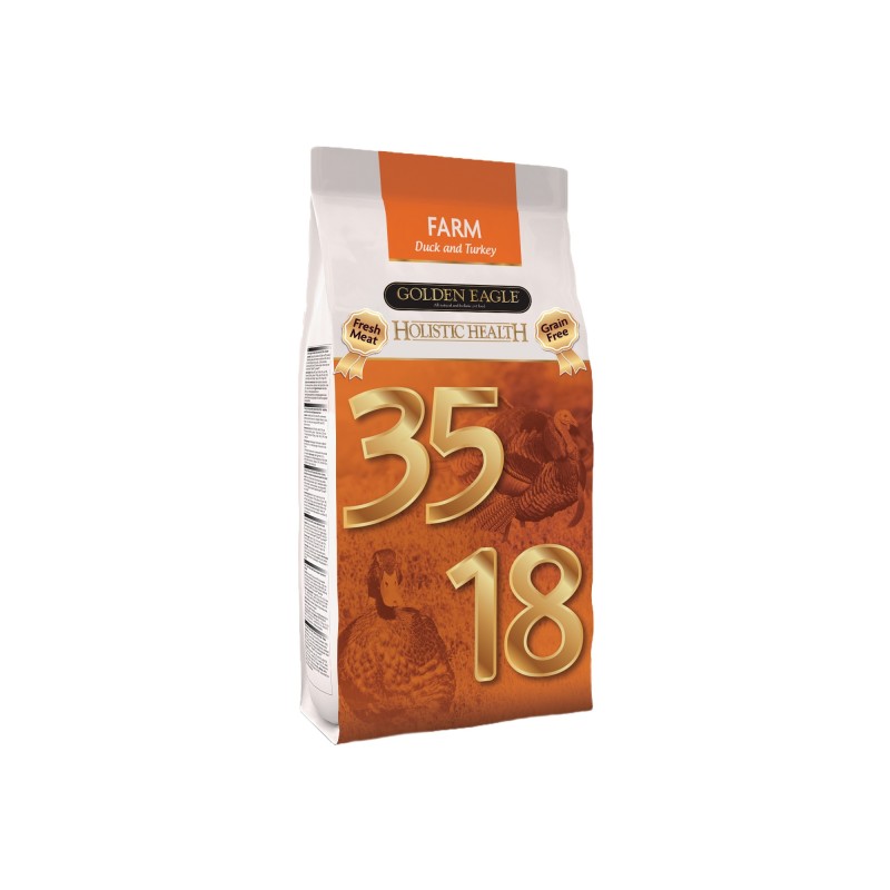 Golden Eagle Farm Formula is made of fresh Duck and Turkey, designed for adult dogs needing an extra boost from High Protein contents of fresh meats. Our duck and turkey are free ranged in U.K. farms and are naturally preserved. The food is high in Omega-3 fatty acids from salmon oil, (especially DHA and EPA) for cardiovascular health and optimal eye and brain function, these high-quality Omega-3’s generate an incredible lush and shine to the dog's coat. The Golden Eagle Farm Formula is a hypoallergenic diet, as it is grain-free and does not contain any ingredients blamed for allergic reactions and continues of our philosophy of Holistic Health, pure healthy nutrition.